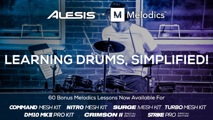 Alesis and Melodics team up to lend fledgling as well as more advanced drummers and key-players a helping hand. Pick up an Alesis-made electronic drum kit or Q MKII Series keyboard and you'll get free access to 60 Melodics lessons on top! Read on to find out more.